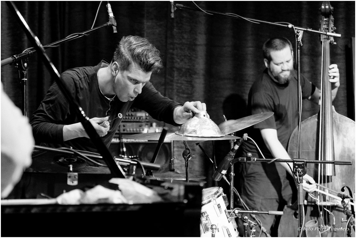 Christian Lillinger & Robert Landfermann 20.12.2016 Nicht Ohne Robert Vol. 16: Robert Landfermann – Kontrabass ; Elisabeth Coudoux – Cello ; Kaja Draksler – Piano ; Philipp Zoubek – prep. Piano ; Christian Lillinger – Schlagzeug © Peter Tümmers