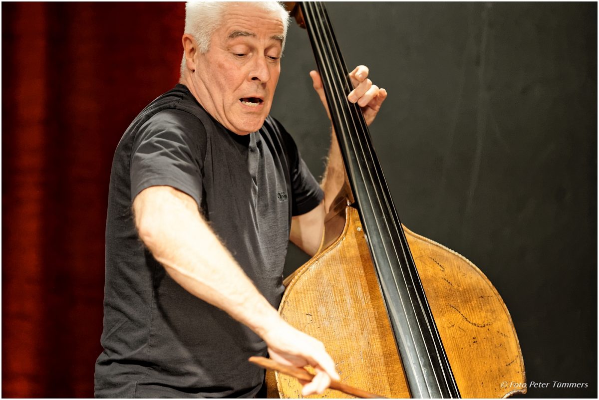 Barry Guy 8.11.2016 BEYOND: Jürg Wickihalder – saxes ; Barry Guy – bass ; Lucas Niggli – drums © Peter Tümmers